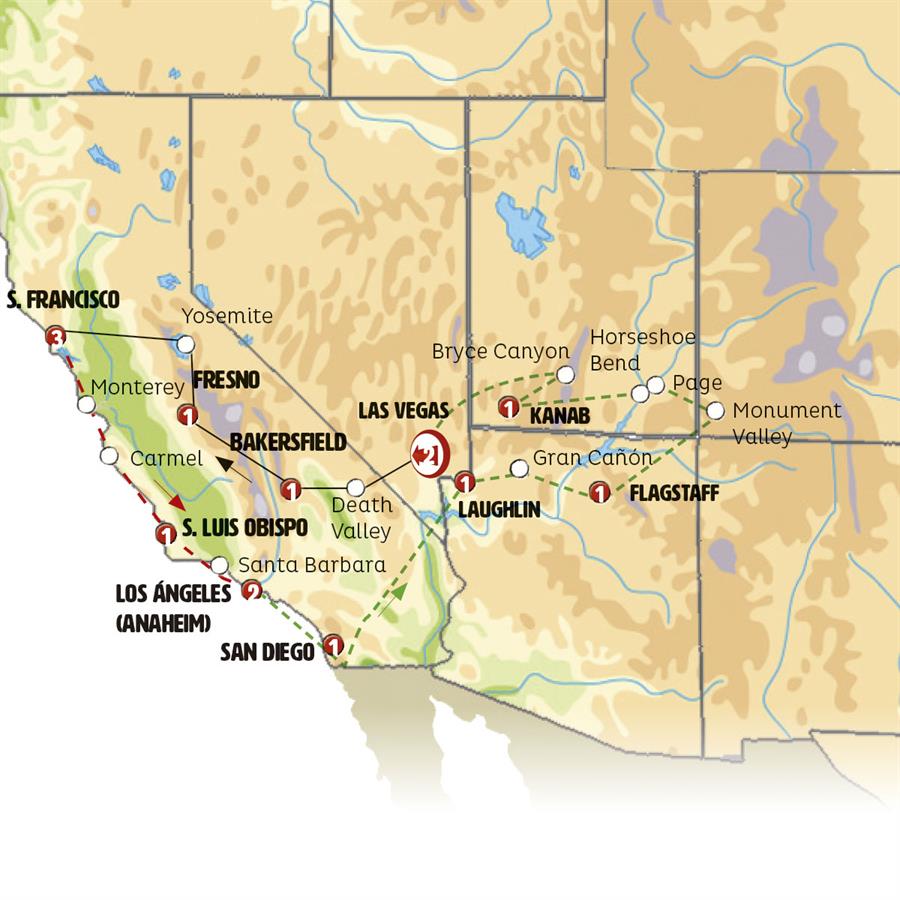 Llegada y traslado al hotel. En la tarde incluimos un paseo por el Downtown y el famoso Strip, la avenida donde se levantan los hoteles, casinos y espectáculos que han convertido a esta ciudad en un auténtico parque temático para adultos. Punto de encuentro Cafetería Starbucks en el 1er nivel frente al concierge de la recepción principal del hotel y el area de los teléfonos.Por la noche ofreceremos opcionalmente Noche de Luces en Las Vegas.